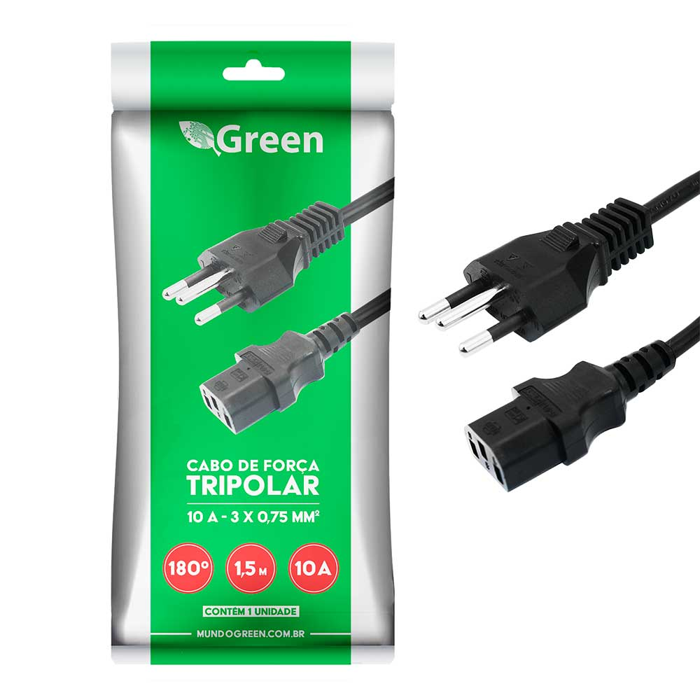 Com especificação tripolar de 10A e condutores de 3x0,75mm, o Cabo de Força Green assegura conexão estável e suporte adequado de corrente elétrica, minimizando riscos de aquecimento e falhas. O comprimento de 1,5 metro oferece flexibilidade na organização de dispositivos, facilitando a instalação e o posicionamento dos aparelhos sem limitações de espaço.