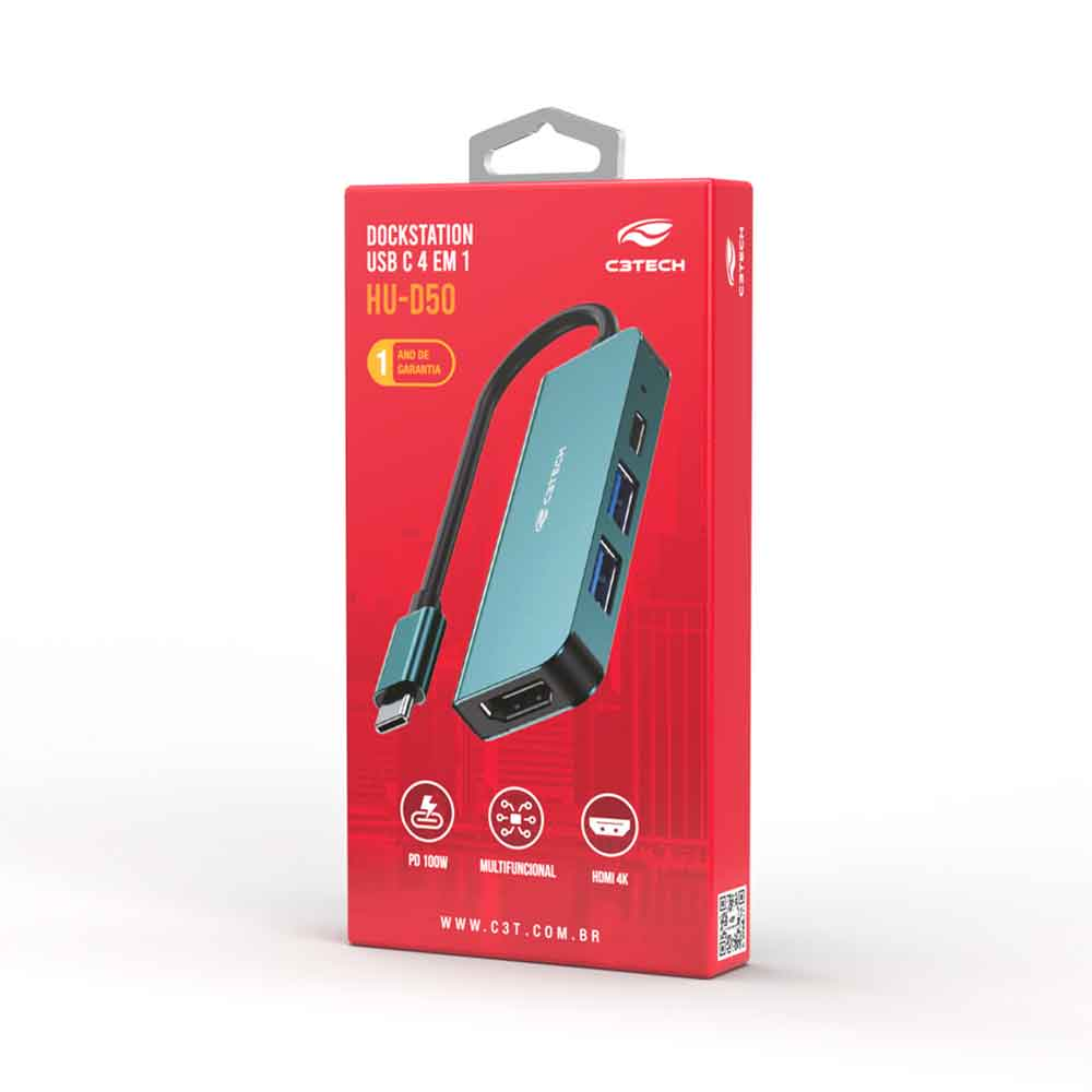 HUB USB-C C3TECH 3.0 4 PORTAS COM SAIDA HDMI 4K HU-D50GY CINZA