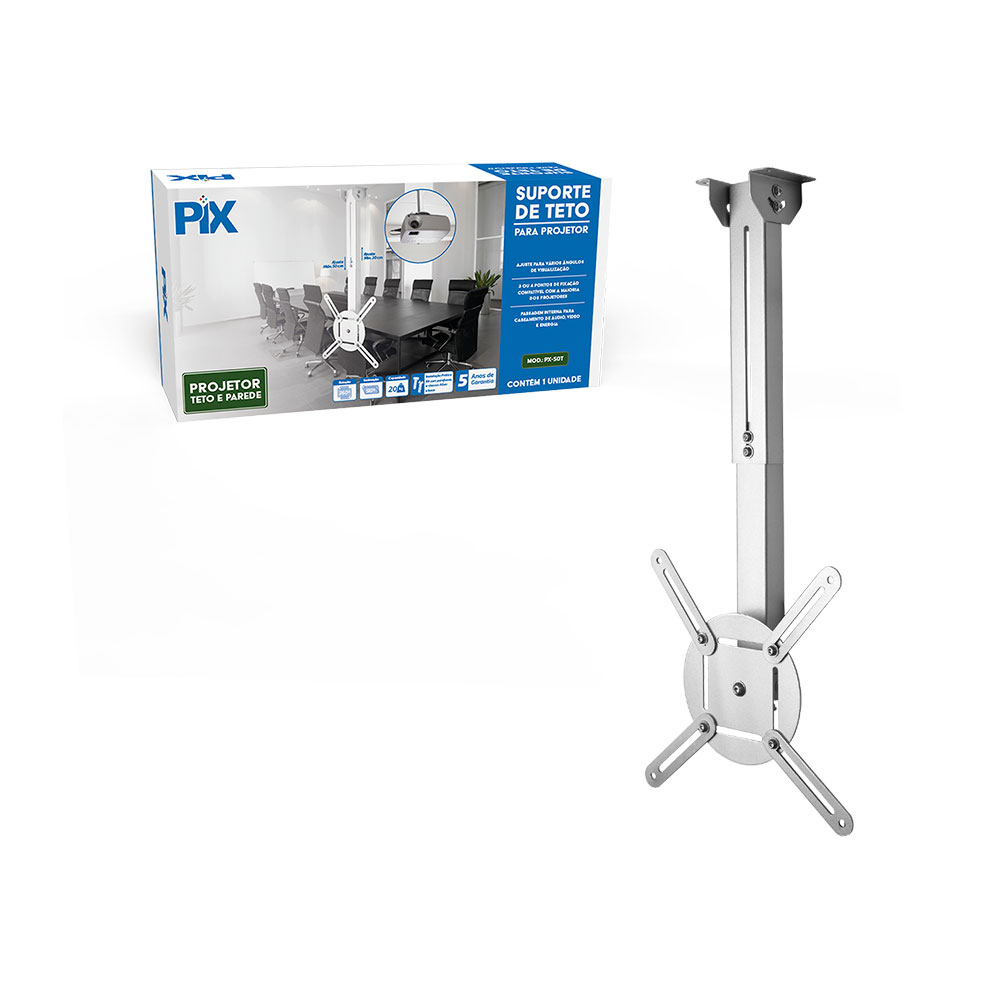 O Suporte projetor de teto da PIX e a solucao ideal para quem busca praticidade e eficiencia na instalacao de projetores. Compativel com projetores que possuem 3 ou 4 pontos de fixacao, ele se adapta a diversos modelos e marcas, sendo perfeito para qualquer ambiente.